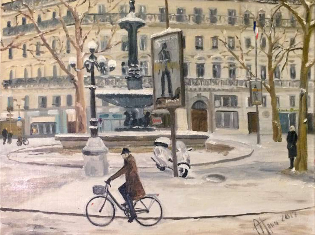 Squaire Courteline en hiver 40×50, oil on canvas. 2017 ( sold)